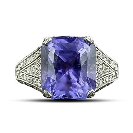 A unique and enchanting faceted cushion-cut sapphire, weighing 10.29 carats, accompanied with a certificate from the AGL - American Gemological Laboratories stating: 'Natural Color-Change Sapphire'. This gorgeous and exotic gemstone exhibits a dreamy combination of blue and violet hues, which blend differently depending upon the light source. The sapphire is magnificently presented in a platinum and diamond-studded mounting, newly handcrafted in timeless Edwardian/early-Art Deco style, intricately ornamented with fine decorative openwork, delicate milgraining, and hand engraving. A truly majestic, magical and impressive sapphire ring. Currently ring size 6 1/2.