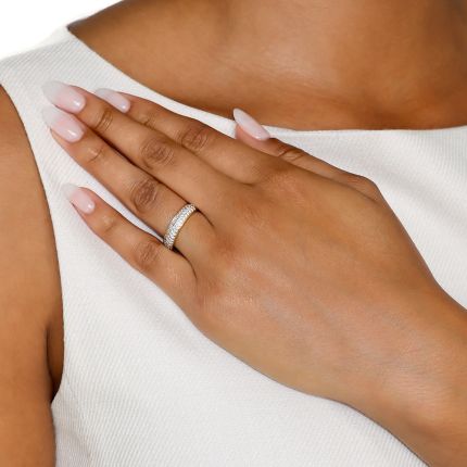 A bright and sparkling 18K yellow gold wedding band, pavé set all around with 1.75 carats of ultra-white round brilliant-cut diamonds, creates an eternal circle of light around your finger. The shimmering jewel can be worn on its own or to enhance a solitaire diamond ring. Now and forever ring size 6 3/4