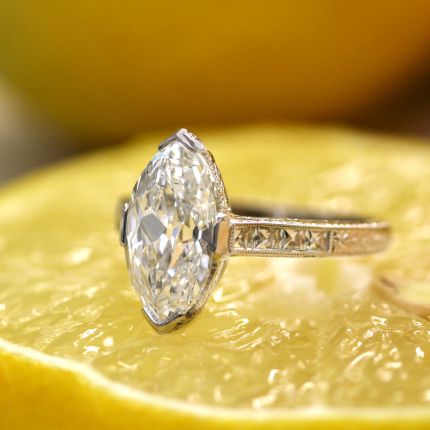 Gorgeous and glamorous with a surprising twist. In this simply sensational Art Deco style engagement ring, a beautifully shaped, colorless 3.07-carat 'moval' (half oval/half marquise) diamond - of early-20th-century vintage - scintillates spectacularly with bright flashes of white light and vivid bursts of prismatic color. Held in an elegant setting embellished with millegrain edging, glittering diamonds, and sleek v-shaped prongs, the dazzling stone is buttressed by shoulders set with gleaming French-cut diamonds, which lead to a ring shank masterfully engraved all around on three sides with a neoclassical wheat pattern.. Heart-stopping--in the best way. Center diamond accompanied by a GIA grading report stating: D - color, SI - clarity. Total diamond weight - 3.51 carats Expertly hand fabricated in true vintage style and signed by Lang. Currently ring size 6 1/2.