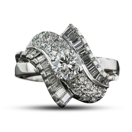 This sweeping kinetic design, rendered in platinum, circa 1950s, sparkles front and center with a bright and brilliant modern-cut diamond, weighing .87 carat. The beautiful diamond sizzles atop a sweep of pavé-set diamonds bordered on each side by shimmering baguette diamonds for an impressive and ultra-sparkling effect. Currently ring size 6.