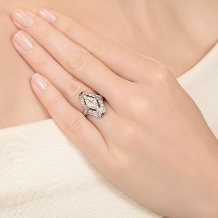 Nary a spot on this magnificent Art Deco dinner ring escaped the skillful and artful hand of the jeweler who so exquisitely created it. The focal point is a 1.22 carat ultra-white and brilliantly sparkling marquise diamond, accented east and west by crescents of vivid blue calibre synthetic* sapphires and lively single-cut diamonds, all intersected by rows of single-cut diamonds. 'V' shapes glittering with European cuts embrace triangular-shaped synthetic sapphires, while a ring shank thoroughly engraved on three sides and milgrain edging add the fine finishing touches to this lavishly detailed Jazz Age jewel. Total diamond weight, 1.97 carats. *Original to the piece, synthetic sapphires were used for their flawless clarity and color consistency. Hand fabricated in platinum, currently ring size 8. GIA Grading Report states: G color - VS1 clarity.