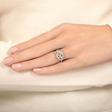 Shimmering ribbons of single-cut diamonds--creating a cool negative space pattern-- sweep and swirl around a crisply sparkling 1.29 carat European cut diamond, in this marvelous 1930s vintage bypass ring. Two glittering round brilliant-cut diamonds, set on a diagonal, add the final dynamic design detail. Total diamond weight, 1.89 carats. Accompanied by a GIA Grading Report stating: N color - VS2 clarity. Hand fabricated in platinum, currently ring size 6 1/4.