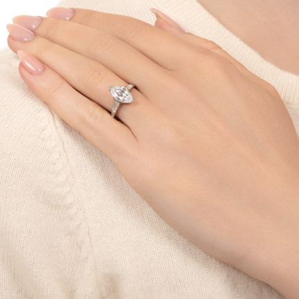 Apparently, it was love at first sight. King Louis XV first beheld Jean Antoinette Poisson at a masked ball in Versailles. Hopelessly smitten, the king made her his chief mistress (oh my!), one bestowed with the title of the Marquise de Pompadour. Declaring that he had never seen more perfect lips than hers, he commissioned the royal jeweler to cut a diamond that reflected their enchanting shape and he named it after her--the marquise. With its captivating curves and icy white color (GIA grade of F - VS1), the 1.50 carat stone that shows off in this Art Deco engagement ring needs little embellishment and is minimally accented with a single baguette diamond on each engraved shoulder. Admit it, you're smitten. Total diamond weight, 1.70 carats. Hand fabricated in platinum, currently ring size 5. Digital GIA Grading Report available stating: F color - VS1 clarity.
