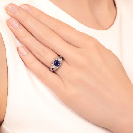 Located in the northwestern corner of the Indian subcontinent, the region of Kashmir has gifted the world with the most stunning, highly-valued and coveted sapphires. The very finest display an extraordinary royal/cobalt blue color and a velvety appearance produced by their silk inclusions. Exceptional Kashmir sapphires are so scarce that they rarely appear at even the most high-end auctions. We have a true gem, and it casts its glorious glowing color at the center of this masterfully crafted Art Deco ring from the 1920s. The splendid 1.74 carat stone, accented east and west with a lively European-cut diamond and a dash of deep blue calibre sapphires, sits atop an artfully pierced hand-fabricated platinum mounting frosted with small glittering European cuts. Pairs of diamonds on the shoulders and millegrain edging throughout add the final design details to this rare, ravishing, and resplendent jewel. Total diamond weight, .60 carat. Accompanied by a gemological report from America Gemological Laboratories (AGL) stating: No heat, Kashmir - origin. Currently ring size 7.