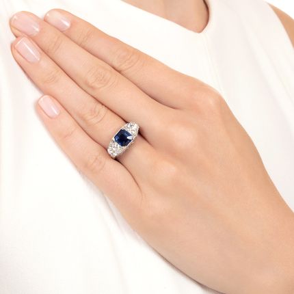Art Deco sophistication is beautifully displayed in this fabulous three-stone ring, artfully hand fabricated in lustrous platinum. A radiant royal blue 2.55-carat emerald-cut sapphire is presented between two scintillating bright white European-cut diamonds, all of which shine atop an exquisitely designed openwork gallery shimmering with single-cut diamonds. Tiny single cuts twinkle on shoulders that lead to a fully hand-engraved shank of this art piece that is a beauty to behold from any vantage. Total diamond weight, 1.80 carats. Currently ring size 6 3/4. GIA Gemological Report for sapphire states: Sri Lanka (Ceylon) origin; Heated.