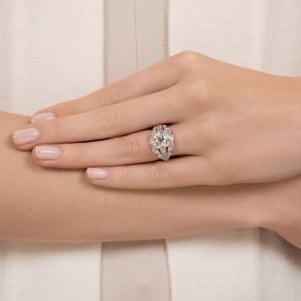 This ring will make you want to kick up your heels--flapper style. Surrounded by a fanciful ribbon-like frame set with glittering single-cut diamonds, and embraced on each side by bright baguette diamond, the exceedingly white 3.00 carat diamond (it appears even larger in its cornered prong setting) that flashes with great flair atop this jubilant Jazz Age jewel is truly a cause for celebration. Hand fabricated in platinum - circa 1920s-30s. Total diamond weight, 3.60 carats. Accompanied by a GIA Grading Report stating: E color - SI1 clarity. In platinum, currently ring size 6.
