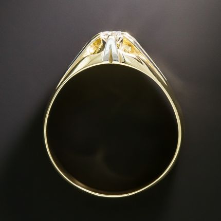 The sleek geometry of the 1920s - 30s Art Deco architecture clearly influenced the design of this scintillating solitaire jewel of the same period. Artfully hand fabricated in two-tone 18K gold and platinum, the four sleekly tapered white gold prongs emerge out of the crisp sculptural mounting to hold aloft a bright and shining .30 carat European cut diamond. A chic, sophisticated, and stunning Jazz Age sparkler. Currently ring size 12.