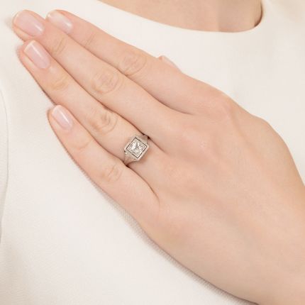 Sometimes it's hip--and chic--to be square. This crisp Art Deco jewel (circa the 1920s-30s) shines with a .bright and beautiful .60 carat European-cut diamond that 'floats' within a two-tiered millegrain-edged frame, and, with its exquisitely detailed mounting, who needs extra diamonds. A fancy side gallery adds curvy flourishes, while the finely pierced shoulders, fashioned with a lush acanthus leaf motif, lead to a ring shank engraved on three sides. Wow! Hand fabricated in platinum, currently ring size 5 1/2.
