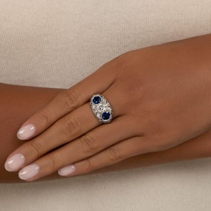This fabulous Art Deco finger-hugger from the 1920s-30s stars three stunning stones. In the center, a sizzling icy-white transitional European-cut/round brilliant-cut diamond (accompanied by a GIA Diamond Grading Report stating: E color - VS2 clarity) is accented by a matched pair of vibrant, rich velvety ultramarine blue cushion-cut sapphires, together weighing 2.20 carats. All three stones are set within floating octagonal settings atop a gently domed crown, thoroughly and intricately ornamented with small round European-cut diamonds, neoclassical piercing, delicate milgraining, and artful hand engraving that continues all around the currently size 8 1/4 ring shank. A trophy ring from the Jazz Age. Hand fabricated in platinum. Both sapphires are accompanied by a gemological report from Stone Group Laboratories stating: Natural, No Indications of Thermal Enhancement).