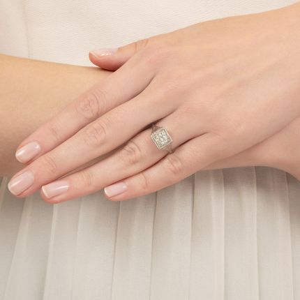 A bright icy-white European-cut diamond, weighing .78 carat, accompanied by a GIA Diamond Grading Report stating: G color - SI1 clarity, radiates from within a consummate, original Art Deco solitaire mounting crisply die-struck and hand finished in platinum, circa 1920s-30s. The striking triple-milgrained square setting has the added advantage of increasing the perceived dimension of the stone. Artful hand engraving finishes this superb and stunning Jazz Age jewel. Currently ring size 5 3/4.