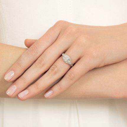 An exquisite confection frosted with shimmering diamonds, this Art Deco ring is ablaze with a .85 carat European-cut diamond in a crisp cornered setting. The scintillating stone, flashing with rainbow sparks and bright white light, centers a pierced, gently domed navette shape illuminated by single-cut diamonds, and is supported by flared shoulders accented with fine millegraining. A distinctive openwork design on the side gallery adds finishing detail. Total diamond weight, 1.10 carats. Hand fabricated in platinum, circa 1920s, it is currently ring size 6 1/4.