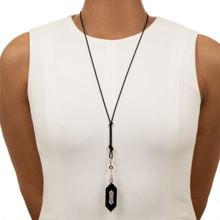 Long necklaces were all the rage during the Art Deco era, complementing as they did the streamlined dresses that were in fashion. This one also adds a dash of drama. The pendant, an elongated hexagon of gleaming onyx, is embellished, in shimmering contrast, by a moval-shaped diamond framed by a glittering array of European-, Swiss-, and single-cut diamonds. Accented below with a single natural pearl, it suspends from a 30-inch black cord via diamond-set elements joined by a donut-shaped onyx. Although the reverse reveals an elegant watch, alas, it is now purely decorative, as its time-telling days are a thing of the past. Total diamond weight, .75 carat. Hand fabricated in platinum and 18K yellow gold.