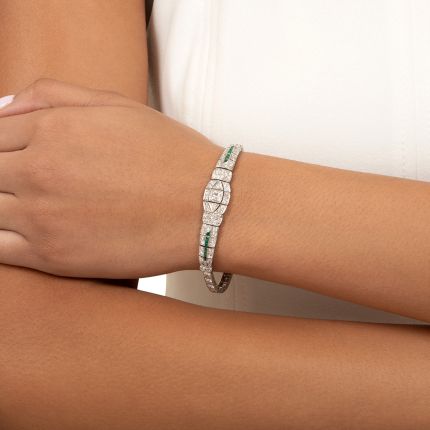 At Lang, we believe that every day is a special occasion. That means super cool, sparkly, and ultra-chic bracelets like this Art Deco beauty are not to languish in your jewel box, making an appearance on your wrist perhaps several times a year. This is why you should wear it regularly. In iconic Art Deco fashion, it is hand fabricated in lustrous platinum with crisp geometric shapes, sparkles brilliantly with European and single-cut diamonds, and has pops of vibrant color courtesy of minty calibre emeralds. From casual weekend brunches to an outing at the museum to your personal time in the coffee shop, wear this bracelet to celebrate those times for what they are—special. Circa the 1920s-30s. Total diamond weight - 3.80 carats, total emerald weight - .25 carat. Measures 6 3/4 inches.