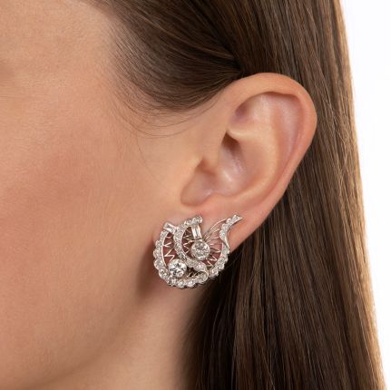 Dating back to the 1930s, these striking, highly stylized leaf motif earrings are designed in a graceful paisley-like shape, set with scintillating European, Swiss, and single-cut diamonds. A crisp zigzag pattern creates a distinctive negative space, while bright baguettes add extra flash. Singular and sensational late-Art Deco sparklers. Total diamond weight, 3.15 carats. Hand fabricated in platinum.