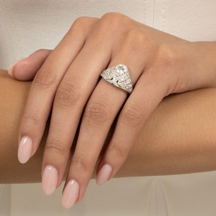 Yes, you are a queen. But wearing a full-on tiara might be a bit much as you go about your daily duties. However, you can still convey your regal status with this stunning Art Deco tiara ring. Hand fabricated in platinum, it is elegantly pierced and shines with a bright .94 carat European-cut diamond in a shimmering surround of European-, Swiss-, and single-cut diamonds. Millegrain detailing throughout and a shank exquisitely engraved all around on three sides add the finishing flourishes to this extraordinary jewel. And if anyone fails to show proper respect, just raise your hand. A rare Jazz Age treasure, circa 1915-1920. Total diamond weight, 1.54 carats. Currently ring size 7.