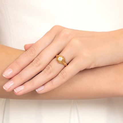 According to the Van Craeynest website, “Brilliance in all artistic endeavors springs from the knowledge of line, form, and composition as well as a solid command of the tools and techniques used in working the medium.” In other words, “Van Craeynest creates poetry in metal.” This Art Deco-style wedding set is an exquisite representation of such "poetry." Die-struck in 18K yellow gold, the mounting is a curvaceous composition of flowers and scrolls, which rise to surround a crisply sparkling .25 carat round brilliant-cut diamond, while a pair of tiny stones twinkle on each shoulder. A matching wedding band perfectly follows the curve of this masterfully crafted ring. Total diamond weight, .30 carat. Currently ring size 5 3/4.