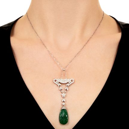 Your bare décolletage is begging for something like this. In this Art Deco-inspired necklace, ribbons, flowers, and leaves—all glittering with round brilliant-cut and single-cut diamonds—form a graceful, curvaceous design that connects to a 14.00 carat carved (front and back) emerald drop by way of a diamond-set bail. The striking composition is joined to a cable chain accented with a single diamond, together creating a dramatic ornament ready to disrupt the space at your neckline. Total diamond weight, 1.29 carats. Hand fabricated in platinum. Chain measures 17 inches, drop is 2 1/2 inches long. GIA gemological report states: Minor clarity enhancement (F1). Origin - Zambia.