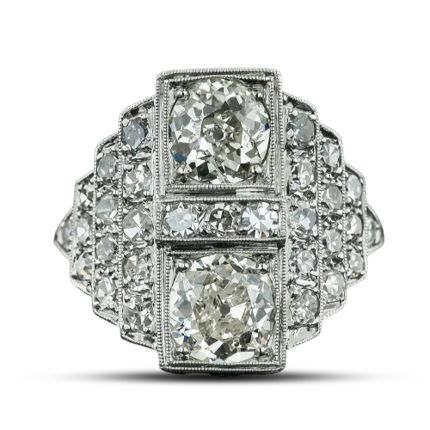 You and me, together forever--surrounded by diamonds! In this fabulous and quite impressive moi et toi ring, two dazzling European-cut diamonds, together weighing 1.68 carats, along with a trio of scintillating single-cut diamonds, create a gorgeous geometric column of sparkle, beautifully complemented east and west by stepped rows of glittering single cuts. A fanciful side gallery fashioned with heart shaped curlicues adds the finishing flourish to this Jazz Age jewel (circa 1920s). Total diamond weight, 2.58 carats. Hand fabricated in platinum, currently ring size 6 1/4. Note: one of the small diamonds is a round brilliant replacement stone.