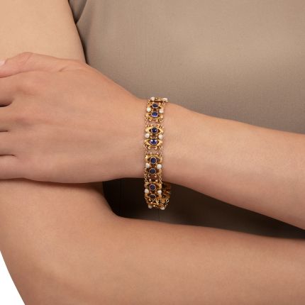 Lithe and lovely, this bracelet features a series of curvy, fluid shapes characteristic of the Art Nouveau aesthetic. The lustrous gold openwork links, joined by small chains, are embellished with shimmering free-form freshwater pearls and an intriguing stone combination—a doublet—of ultra-bright blue glass topped by a thin layer of garnet (original to the piece), giving the appearance of gemmy sapphires - no one will ever suspect ;). A delightful piece of Nouveau artistry to encircle your wrist. Total doublet weight, 2.50 carats. Crafted in 14K yellow gold, circa 1900, it measures 7 inches.