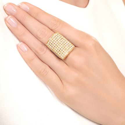 This ring has special powers—it has a big, bold presence in an understated kind of way. Rendered in 18K yellow and 18K white gold (side diamond settings), it lies low on the finger with a gently domed rectangular top shimmering with pavé-set round brilliant-cut diamonds, supported by wide, flared shoulders that shine with the same. We dare you to give all your other jewelry a rest and wear only this on a day when you're feeling particularly fierce. A bona fide "WOW!" ring. Total diamond weight, 5.06 carats. Currently ring size 7.