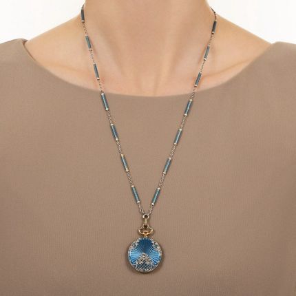 A beguiling blue beauty. This glorious pendant watch, masterfully decorated with dusky hydrangea-blue guilloche enamel and a lacy platinum floral design that glints with tiny rose cut diamonds, suspends from a complementing 22-inch chain via its fancy diamond-dotted bow. And though it has a lovely, easy-to-read dial on the reverse, this timepiece has transitioned and is now solely an exquisite jewel--its Swiss movement no longer works. Just as well. As Albert Einstein so aptly stated, "Time is an illusion." Crafted in 18K yellow gold and platinum. The case is French. Condition note: enamel shows some fine cracks and wear.