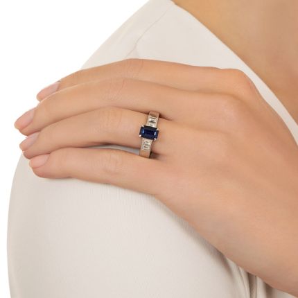 A rich, velvety royal blue emerald-cut sapphire, weighing 1.40 carats, radiates between a gleaming pair of icy-white baguette diamonds, in this sleekly tailored finger-hugger substantially crafted in platinum. A perfect alternative engagement ring or just-for-fun right hand ring. Total diamond weight, .44 carat. Accompanied by a gemological report from Stone Group Laboratories stating: Evidence of Thermal Enhancement, Madagascar - Origin. Currently ring size 5 1/4.