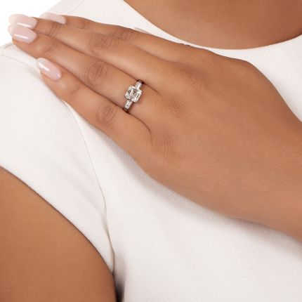 We've said it before and we'll say it again, diamonds make geometry fun. And there's no denying it with this gorgeous ring. Crisp angles abound beginning at the center with the fabulously flashing 2.01 carat uber-white square emerald cut (aka Asscher-cut) diamond, kissed on each side by a high-color mirror-like tapered baguette, all supported by a lustrous platinum shank. A+ for scintillating sparkle! Total diamond weight, 2.15 carats. Currently ring size 6 1/2. GIA Diamond Grading Report states: F color - VS2 clarity.