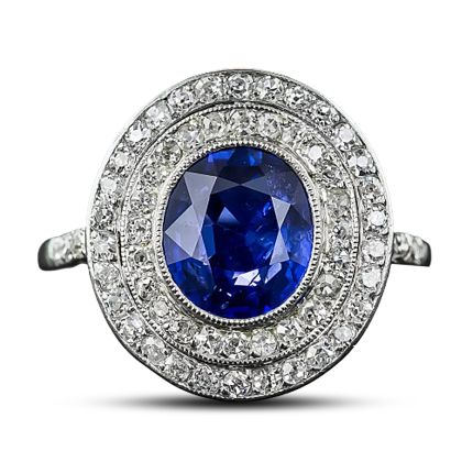 From the first or second decade of the last century comes this classic Edwardian treasure, expertly handcrafted in platinum, features a 3.80 carat rich royal-blue, faceted oval sapphire, and bears a certificate from the Swiss Gemological Institute stating: No indications of heating. Origin: Burma (Myanmar), dated: Basel, 8 April 2015. The rare and enchanting gemstone centers a double halo of twinkling rose-cut diamonds supported by an intricately designed under gallery and diamond-set shoulders. Total diamond weight, .70 carat. Most likely of French origin, the stunningly beautiful ring is currently ring size 8 1/2.