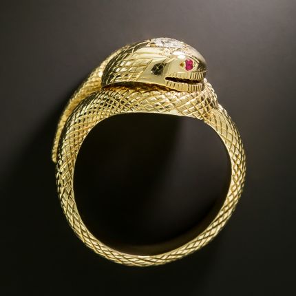 Snake yoga pose? We're not sure if this serpent is trying to work out a kink or just showing off his flexibility. Whatever the intent, his weighty, intricately coiled, beautifully hand-engraved body creates a cool, curvy design to wrap around your finger. Even better, he's from the diamond-headed, ruby-eyed species. Hand fabricated in 14K yellow gold, circa early-20th century, this Edwardian jewel is currently size 10.