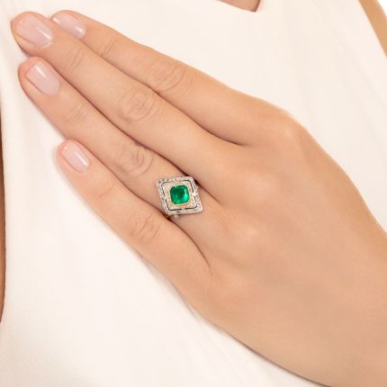 Old mine Colombian (Muzo) emeralds don't come any greener than this spectacular specimen, weighing 1.20 carats, for which an expert Edwardian-era jeweler created this classic lozenge-shaped finger bauble. Accompanied by a GIA Emerald Origin Report stating: Colombian origin, Minor (F1) clarity enhancement, the enchanting gemstone radiates from within an 18K yellow gold bezel setting, embellished all around by double-tiered diamond-set frames, while pairs of tiny bezel-set twinklers grace the V-shaped shoulders and ring shank. A ravishing rarity, finely hand fabricated in platinum over 18K gold, circa 1915. Total diamond weight, .35 carat.