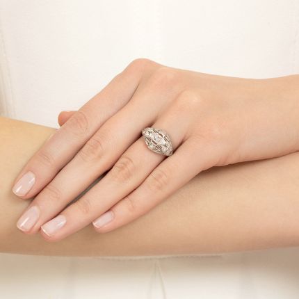 Platinum lace, also known as filigree, creates an exquisite dome atop this gossamer-like Edwardian/early Art Deco jewel. At its center, a bright white .40 carat marquise diamond, with an east/west orientation, sparkles in a surround of exquisitely worked filigree dotted with lively single-cut diamonds, while finely engraved shoulders adorn the currently size 6 shank. A shimmering delight perfect for any finger—pick one! Total diamond weight, .65 carat. Hand fabricated in platinum, circa 1915-1920.
