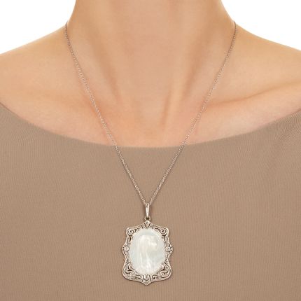Masterfully pierced and twinkling with tiny rose-cut diamonds and two larger European-cuts, the beautifully shaped frame on this Edwardian pendant (dating back to the first or second decade of the twentieth century) creates the perfect surround for an ethereal, iridescent mother-of-pearl plaque carved with an image of a beatific Madonna in profile. Divine. Total diamond weight, .50 carat. Hand fabricated in platinum over 14K yellow gold, it suspends from an 18-inch chain.