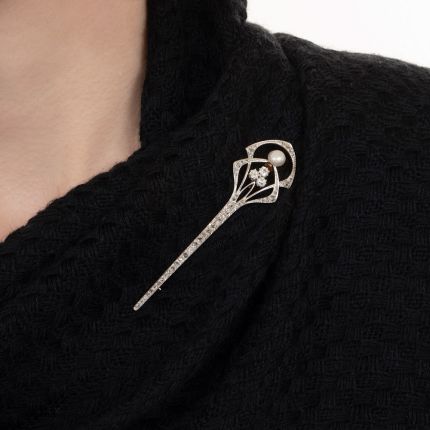 Edwardian Natural Pearl and Diamond Aigrette Pin - GIA