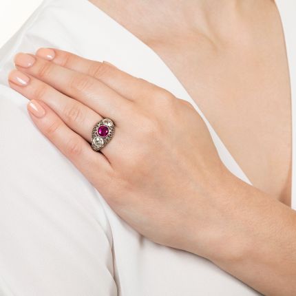 A gorgeous 1.45 carat ultra-vibrant electric candy apple-red (wait till you see it in person!) natural no-heat ruby is the mesmerizing centerpiece of this exquisite original Edwardian bombé-style three-stone ring. The enchanting bezel-set gem is highlighted on each side by a bright and shining 1.00 carat-plus European-cut diamond (total weight, 2.10 carats) set in platinum bezels. Delicately pierced openwork creates a graceful, neoclassical scrolled foliate design, leading to a hand-engraved ring shank in this superb and stunning Edwardian jewel, dating back to the first or second decade of the twentieth century. Hand fabricated in platinum, currently ring size 6 1/4. GIA gemological report states: No heat. Inconclusive origin (however, Burmese would be the most logical assumption).