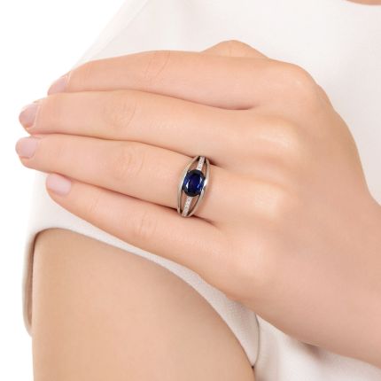 A classic style with a couple of twists and turns. This chic estate ring glows with an ultra-vivid 1.95 carat oval cobalt blue Madagascar sapphire, set horizontally and supported by shoulders that shimmer with bright round brilliant-cut diamonds, all of which are framed by gleaming platinum 'ribbons' that create a cool openwork design. Currently ring size 6 1/2. The gemological report from Stone Group Laboratories states: Indications of thermal enhancement. Madagascar - origin.