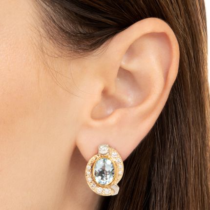 Bringing a chic vintage vibe, these estate earrings feature glimmering, swimming pool-blue aquamarines nestled in crescents of crisply sparkling round brilliant-cut diamonds. Each is accented with a single square-set diamond that adds an extra spot of sparkle, while millegrain edging provides subtle texture. Total diamond weight - 1.00 carat, total aquamarine weight - 6.25 carats. Hand fabricated in 18K yellow gold.