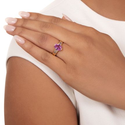 A magnificent gemstone. Weighing 2.68 carats, this natural, unheated sapphire from Ceylon (Sri Lanka) is imbued with a truly resplendent incandescent pink glow. The enchanting gem is tastefully presented atop a gleaming 18K yellow gold band ring enlivened on each shoulder with flush-set rows of seamlessly-set baguette diamonds. Utterly stunning. Total diamond weight, .60 carat. Currently ring size 6 1/2. Accompanied by a gemological report from Stone Group Laboratories stating: Natural, No Indications of Thermal Enhancement. Sri Lanka (Ceylon) origin.