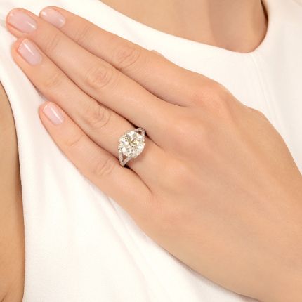 Why wish upon a star when you can have one on your finger? Bearing a subtle sunshiny hue, the astonishing 5.91 carat European-cut diamond (circa 1920s) that sparkles with abandon atop this extraordinary estate jewel flashes with fiery rainbow sparks and bright light, its understated clip-like prongs allowing the stone's full beauty to show without distraction. The radiant gem is supported by a diamond-frosted gallery and by diamond-set split shoulders that lead to a fully diamond-set shank. A breathtaking dream come true. Total diamond weight, 6.51 carats. Hand fabricated in platinum, it is a ring size 6. GIA Diamond Grading Report states: O,P color - VS1 clarity. Condition note: one diamond is chipped.