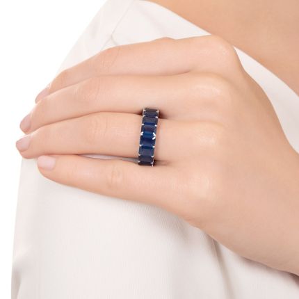 Seventeen glistening emerald-cut sapphires, together weighing 9.00 carats, are seamlessly set in 18K white gold to create this sensational never-ending circle of glorious rich royal blue around your finger. Understated elegance par excellence. Now, and forever, ring size 6 1/4. Accompanied by a gemological report from Stone Group Laboratories stating: Indications of thermal enhancement. Undetermined origin.