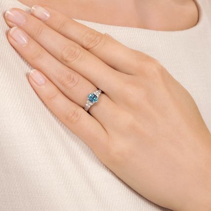 A modestly sized (.86 carat) bright cerulean blue aquamarine beams brilliantly between sparkling white diamond-set shoulders, supported by an upper ring shank gleaming with small, seamlessly set baguette diamonds. A sweetheart.Total diamond weight, .31 carat. Crafted in platinum, currently ring size 5.