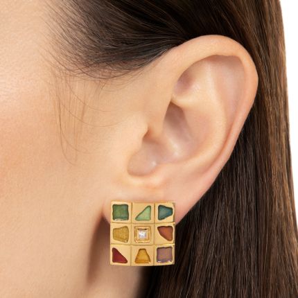 The vision of the jewelry house of Bagués is to bring light and color to emotions. Established in Barcelona, Spain, the jewelers employ the ancient technique of firing enamel to produce pieces radiant with vibrant hues, as displayed in these earrings. Designed as squares within squares crafted with gleaming 18K yellow gold and colorful enamel, each twinkles at its center with a single princess-cut diamond, creating an artistic collage of color and sparkle at your lobes.