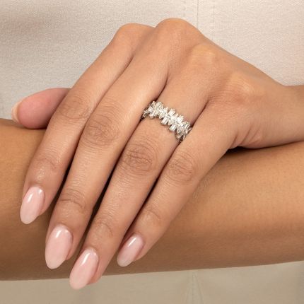 This is one eternity band that does not fit into the 'classic' category. Dynamic in design, it flashes and sparkles with marquise diamonds that alternate with stacked pairs of baguettes, altogether creating a cool organic vibe. Quite the statement when worn alone, it also adds energy to any ring stack, and is an utterly unique choice for the avant-garde bride. Total diamond weight, 3.60 carats. Hand fabricated in platinum, it is now and forever a ring size 7 3/4.
