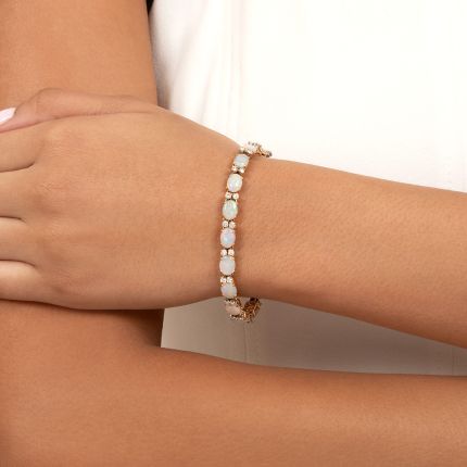 Every opal is a small universe of mesmerising color. Seven such universes grace this estate bracelet, each glowing with iridescent hues of pinkish-orange, blue, and green. Together, with alternating pairs of icy-white round brilliant-cut diamonds, they create a glorious display of color and sparkle to orbit your wrist. Total opal weight - 9.00 carats, total diamond weight - 1.40 carats. Crafted in 14K yellow and white gold, it measures 7 inches.