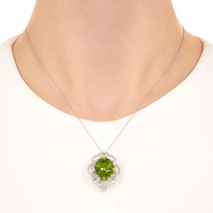 Glimmering and imbued with an electric lime hue, the 9.73 carat oval peridot in this eye-catching estate pendant shows off in a lacy surround of icy-white round brilliant-cut diamonds. A bold splash of color and sparkle ready for display at your neckline. Total diamond weight, .80 carat. Crafted in platinum, it suspends from an 18-inch chain.