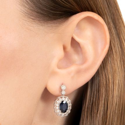Sapphires all dolled up. The glistening, ultramarine-hued sapphires in these regal and ever-in-vogue drop earrings are surrounded by frilly halos that twinkle with icy-white, round brilliant-cut diamonds, all dangling beneath pairs of bezel-set diamonds. Fancy finery to frame your face. Total diamond weight - .74 carat, total sapphire weight - 3.61 carats. Crafted in 18K white gold. GIA Gemological Report for both sapphires states: 1) No indications of heat. Australia - origin. 2) Heated. Madagascar - origin.