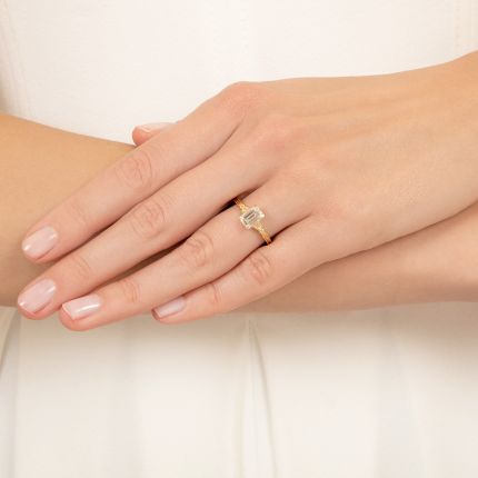 Sensational! In this classic Lang Collection jewel, a dazzling 1.00 carat emerald-cut diamond is simply and elegantly presented atop a fluted yellow gold shank with pierced shoulders that shimmer with trios of twinkling round brilliant-cut diamonds. A crisp geometric design on the side gallery adds the finishing detail to this elegant and exquisitely detailed ring. As always in our Lang Collection, we use 100% recycled precious metals and ethically-sourced diamond melee. Total diamond weight 1.02 carats. In 18K yellow gold, it is currently ring size 6 1/2. GIA Diamond Grading Report states: J color - SI2 clarity.