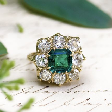 In this ravishing and resplendent *Lang Collection ring, a beautiful octagonal Colombian emerald, weighing 2.64 carats, casts a gorgeous deep bluish-green glow from within a glittering frame of eight European-cut diamonds, together weighing 3.40 carats. This captivating confection of color and sparkle is supported by a hand-engraved gallery, reminiscent of slender leaves, and by a gently tapered shank engraved with an elegant vine-like design. A breathtaking beauty. Signed Lang. The emerald and diamonds are early-20th-century vintage, taken from an unsalvagable worn out ring. Accompanied by a gemological report by the GIA stating: Minor Clarity Enhancement (F1) - Colombia, Origin. Hand fabricated in 18K gold, currently ring size 6 1/4.