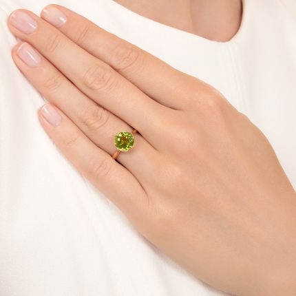 Turkish sultans were smitten with peridot and amassed the largest collection in the Ottoman Empire. By all accounts, the dandy King Edward VII declared the lively stone to be his favorite. And no wonder—its vibrancy and brilliance are enthralling. The 2.87-carat stone that crowns this Lang Collection vintage-inspired ring is radiant with an irrepressible bright apple-green hue, and, needing little else in the way of embellishment, it rests in an elegant setting supported by a sleek ribbed shank. Time to join the esteemed rank of distinguished peridot lovers. Crafted in 18K yellow gold, it is currently ring size 6 1/4.