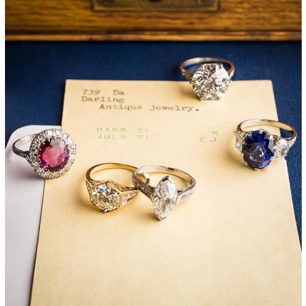 Like fine wine, fine jewelry also has a “vintage”—the design period or era from which it hails. Victorian or Edwardian, Art Deco or Retro, each piece in our collection has its own special pedigree. But just because one era ended and another began, it doesn’t mean that creative jewelry makers simply forgot the lessons of the past! Many of the jewels in our cases refuse to conform to a single design period, either by striking out on their own or showing the transition from one era to the next. When such daring dazzlers are over one hundred years old, they’re generally grouped in the antique category. Anything younger than that, but still made before 1970, fits the vintage label. Every iconic era yields both singular and transitional pieces, like the ones we’ve assembled here. Follow the link at the end of each section for more about the aesthetics and history of the period.