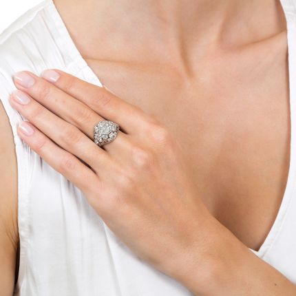This rare, ravishing and romantic late-Edwardian/early-Art Deco jewel, dating back to the first or second decade of the twentieth century, features a bright and shining 1.71 carat European-cut diamond sparkling atop a dazzling diamond-studded dome. Hand fabricated in platinum, the stone is enveloped with small European-cut diamonds set in hand-pierced, heart-shaped settings accentuated with millegrain engraving. A romantic dream ring. Total diamond weight, 2.66 carats. Currently ring size 7. Accompanied by a GIA Diamond Grading Report stating: K color - VS2 clarity.